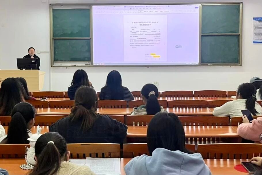 随後,輔導員李嘉欣老師就實習期間的各項注意事項、管理規定、通知安排等進行了詳細說明。圍繞同學們可能遇到的實際情況,李老師重點講解了安全規範、紀律要求與常見問題應對,幫助大家全面了解制度、築牢安全意識,為平穩、順利地開展實習工作做好充分準備。